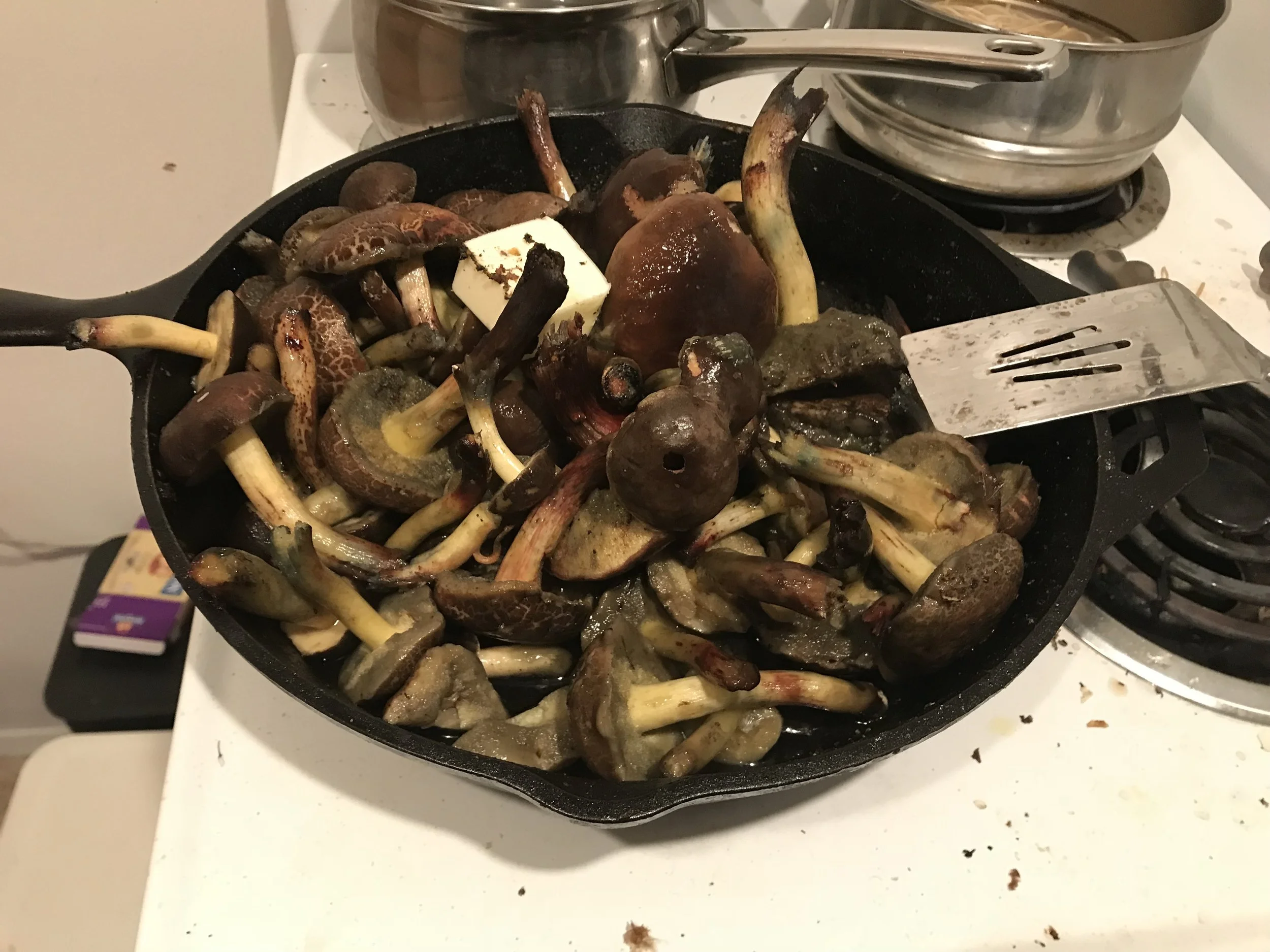 Cooking up some red cracked boletes (Xerocomellus chrysenteron) — one of my favorite mushrooms. Some people aren’t a fan of them because they do not have the firm, even flesh of king boletes or chanterelles, but I like their coloring and nutty flavor. They’re so flavorful that I think they’re best cooked in nothing more than butter and salt.