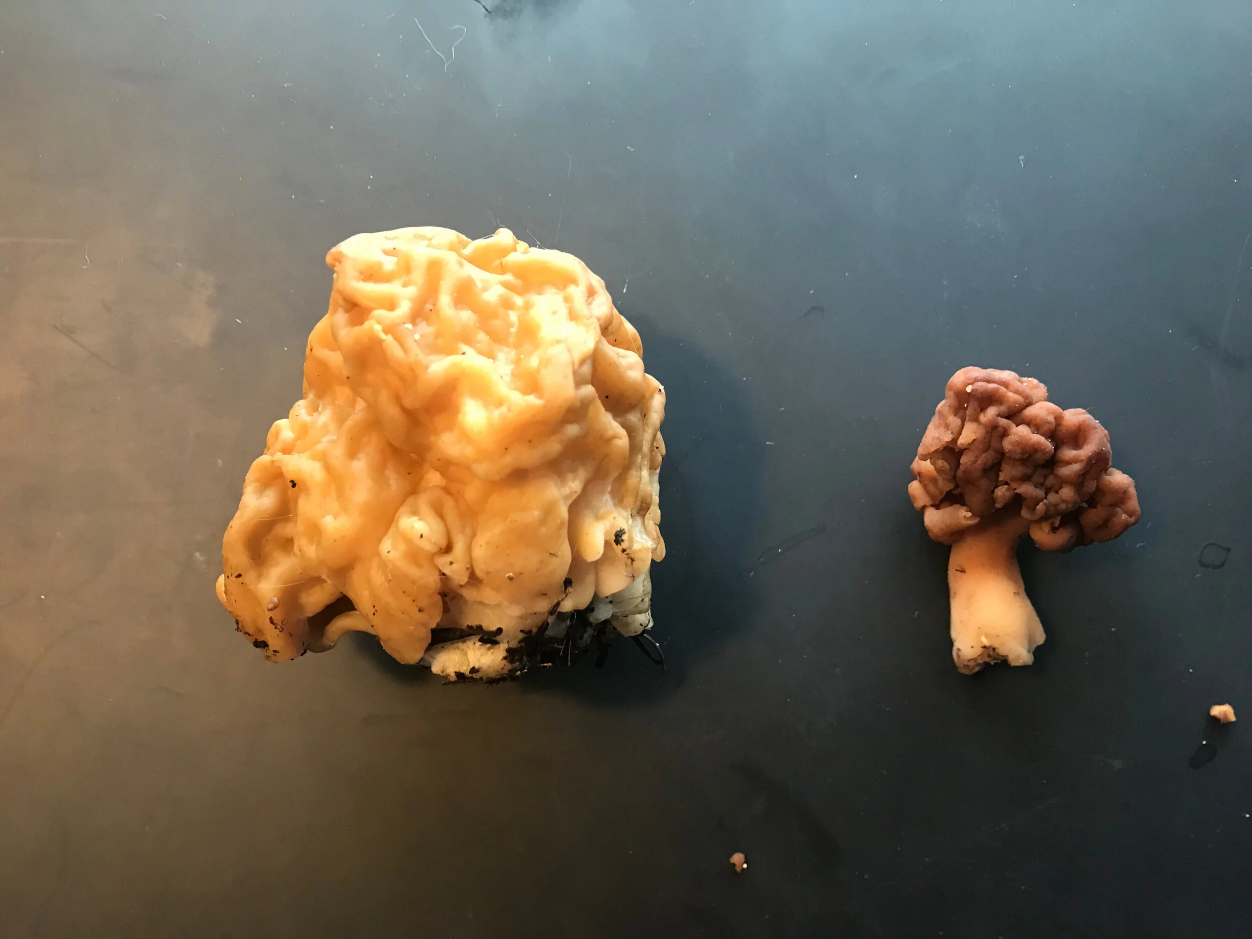 On the right: a lookalike, Gyromitra esculenta. Don’t eat them! They are highly poisonous and contain the same chemical found in jet fuel!